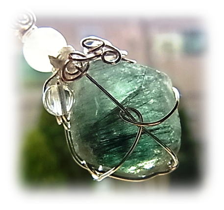 天然状態での原石インディゴライトブルークォーツを使ったワイヤーアートのペンダントは、他では見られない、オリジナリティ