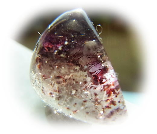 透明な水晶の中に漂うスモーキーアメジスト色のインクルジョン、そしてレピドクロサイトなどの鉱物が、
