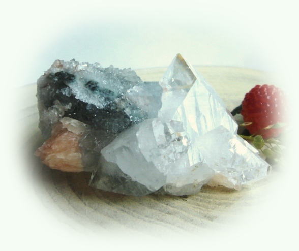 見る角度により、其々表情に特徴があり、とても印象的なアポフィライトです・・・。光沢のある美しいベビーピンクのスティルバイト付です。